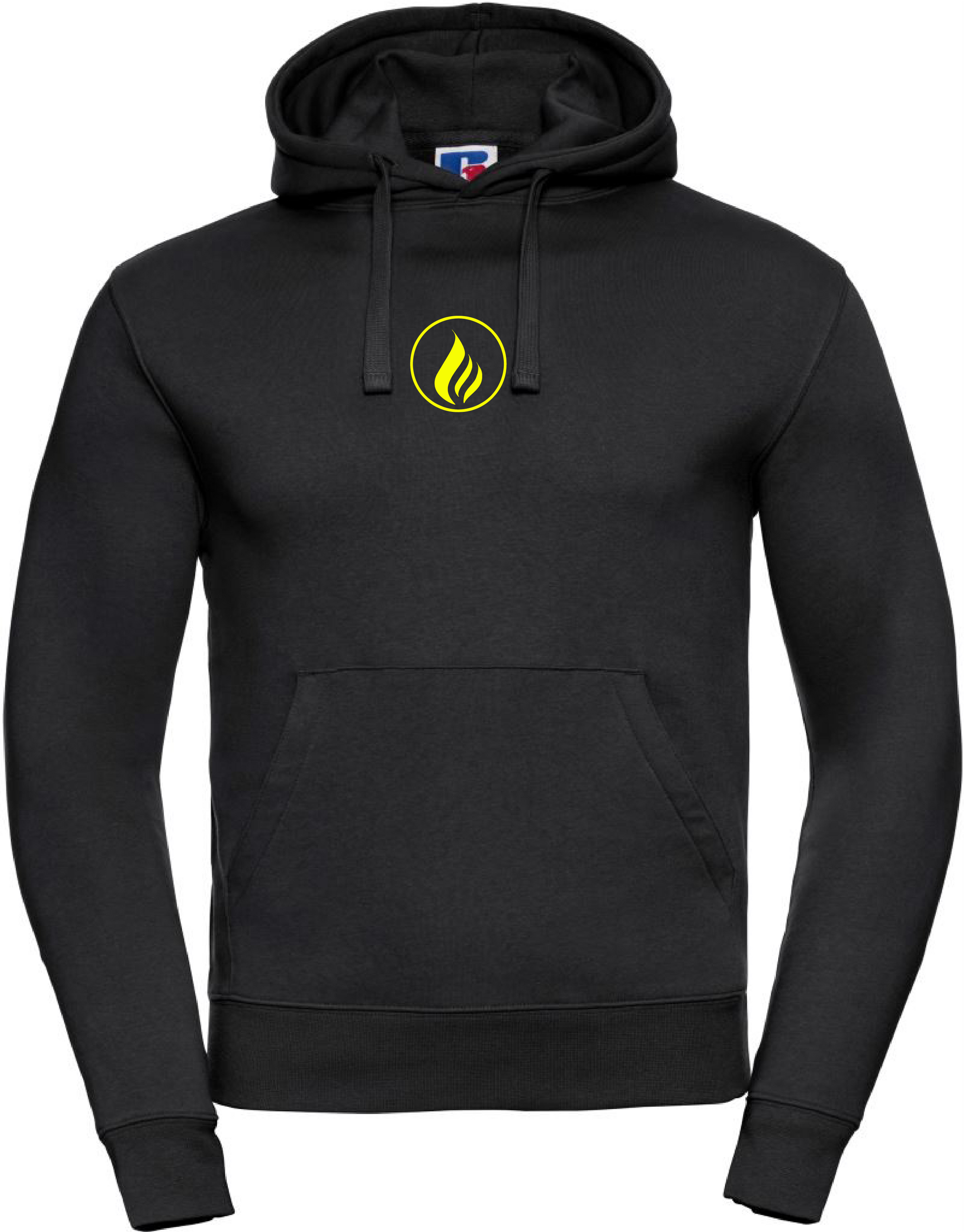 Hoodie mit Flamme auf der Brust und Schriftzug auf dem Rücken.